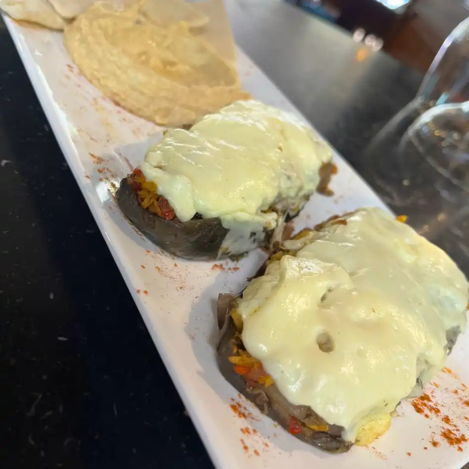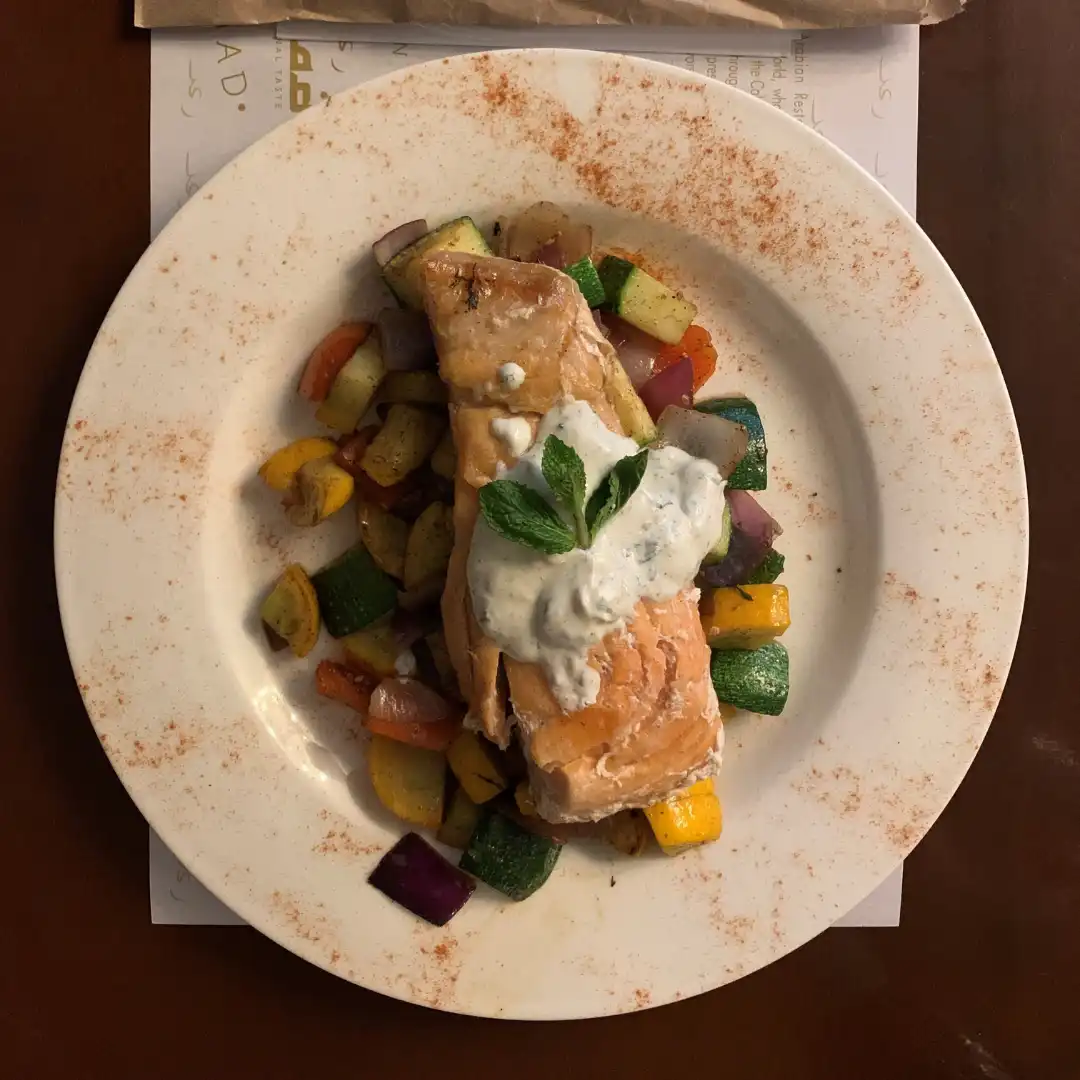 Queso a la parrilla acompañado de mezcla de vegetales salteados con especias árabes. Acompañado con pan árabe de la casa.