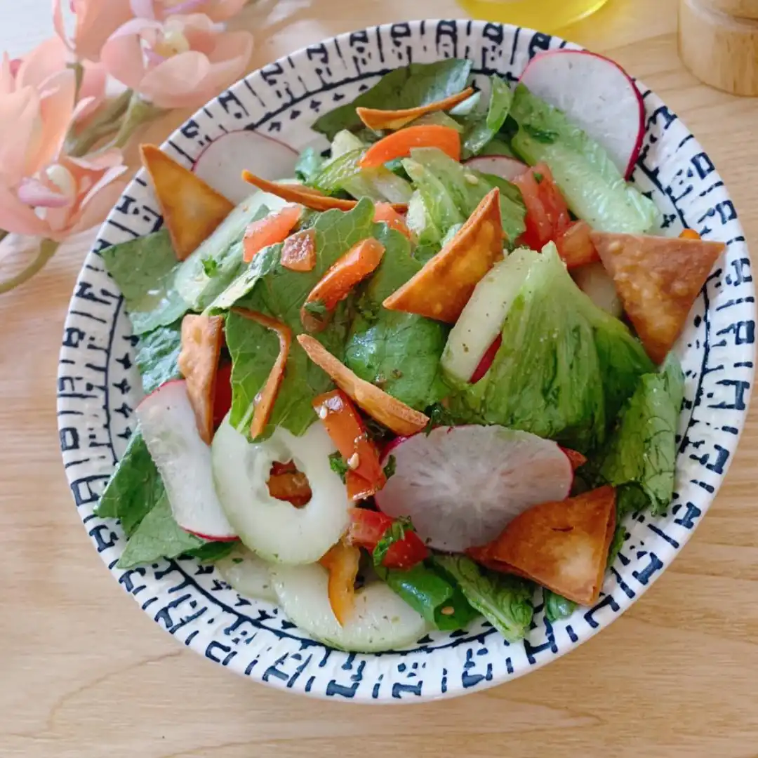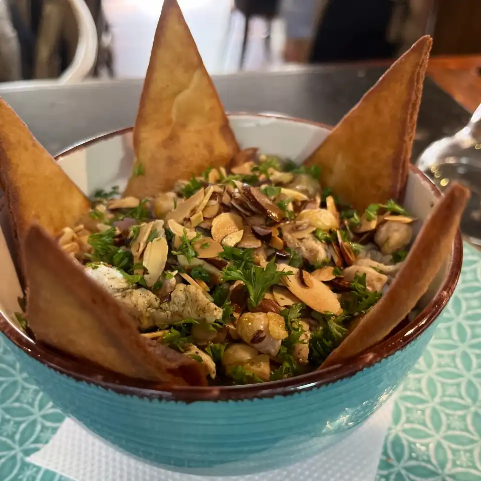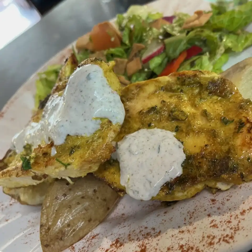 Pollo marinado en labneh, perejil y especias árabe; acompañado con papa casco y ensalada fattoush.