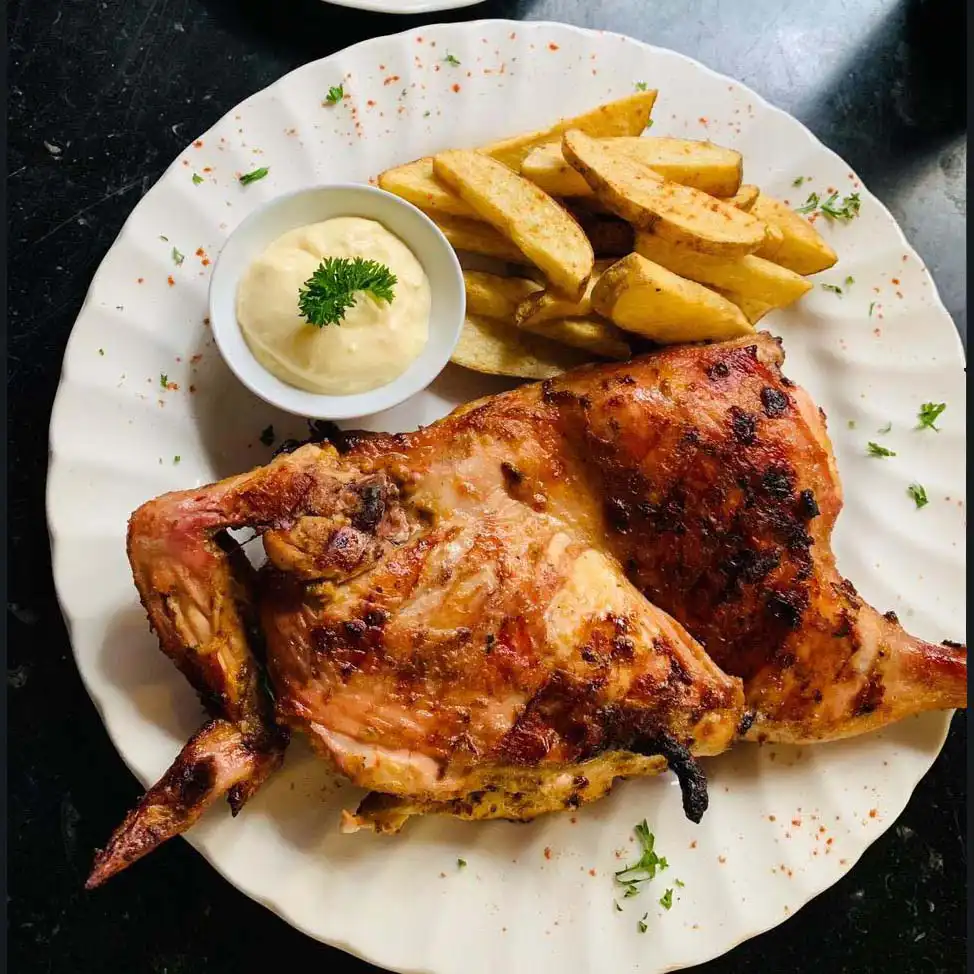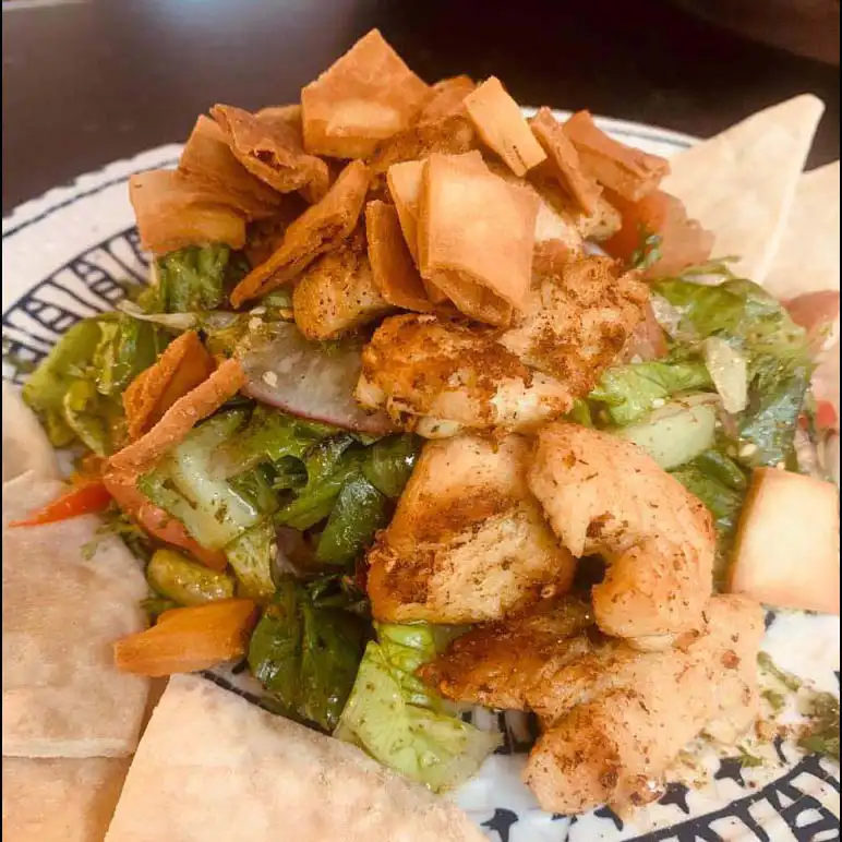 Pollo marinado en especias árabe asado a la parrilla; acompañado con papa casco, ensalada fattoush y salsa con ajo de la casa.