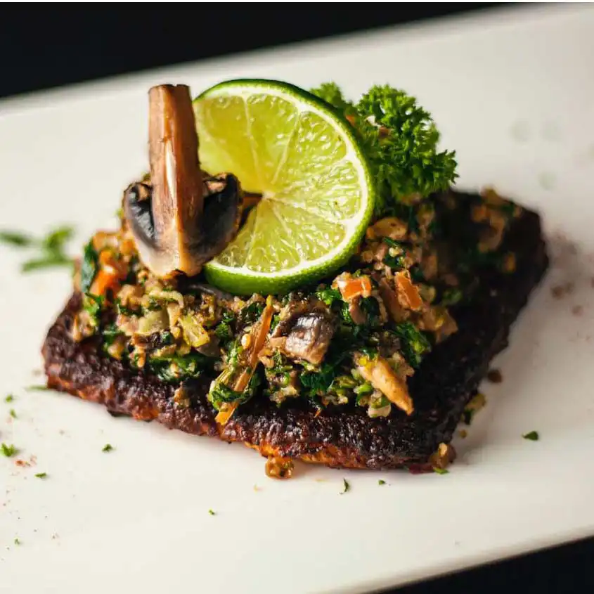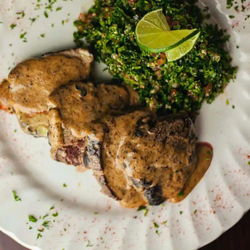 Lomo de res sazonado con siete especias del mundo árabe, acompañado de pure gratinado y tabule.
