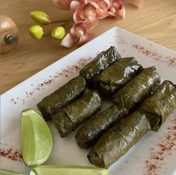 Hojas de parra frescas remojadas en aceite de oliva, rellenas de carne de res, arroz y condimentadas con especias árabes. Acompañadas de Limón.