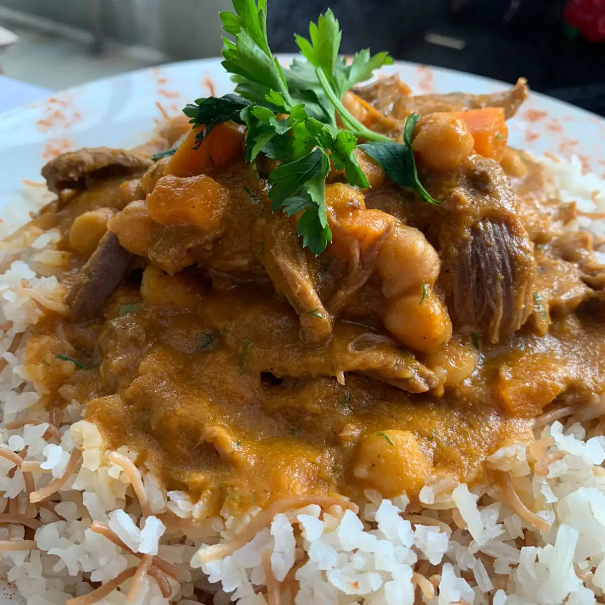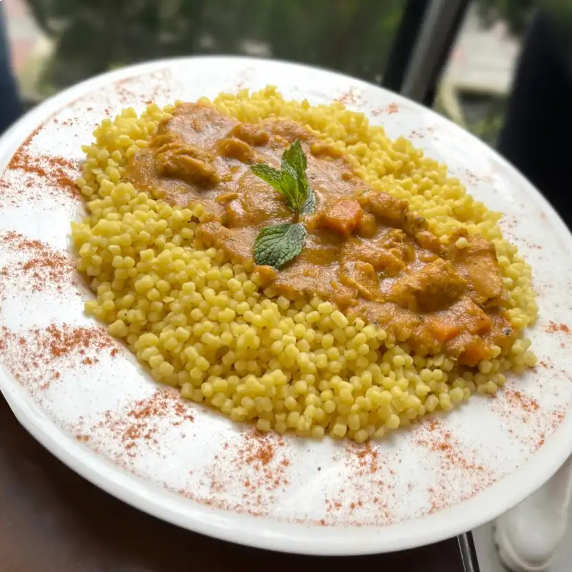 Estofado de pollo con verduras sobre pasta árabe a base de trigo. Acompañado con pan árabe de la casa.