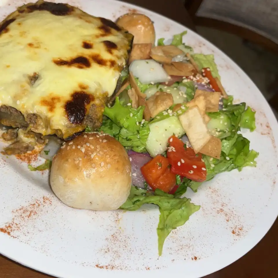 Lasaña de berenjena con carne de res, acompañado de ensalada fattoush y pan árabe de la casa.