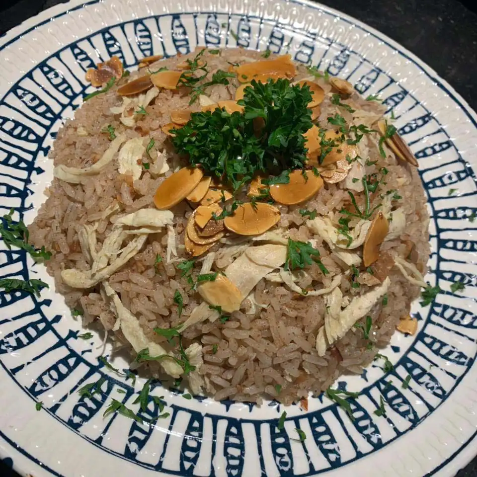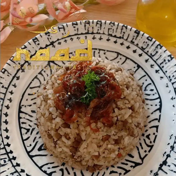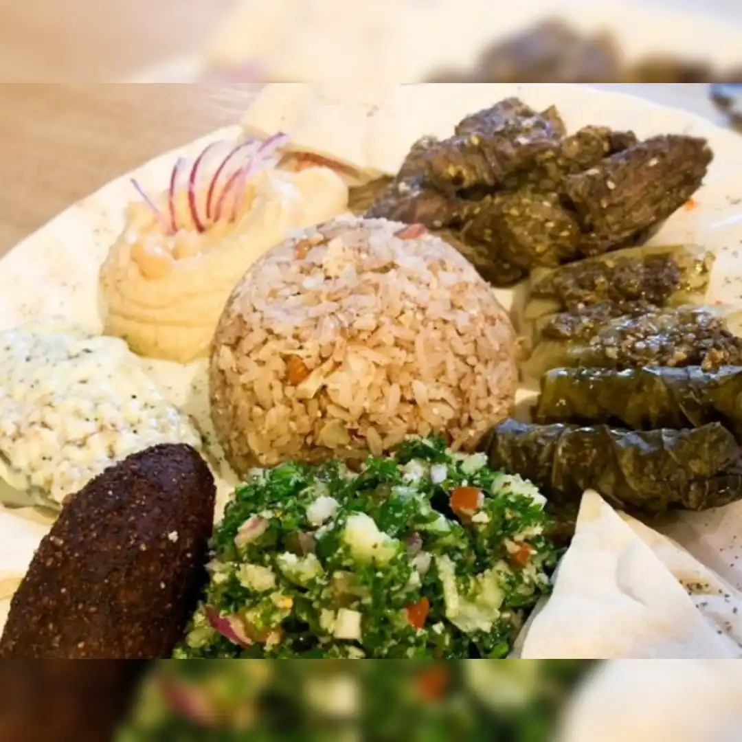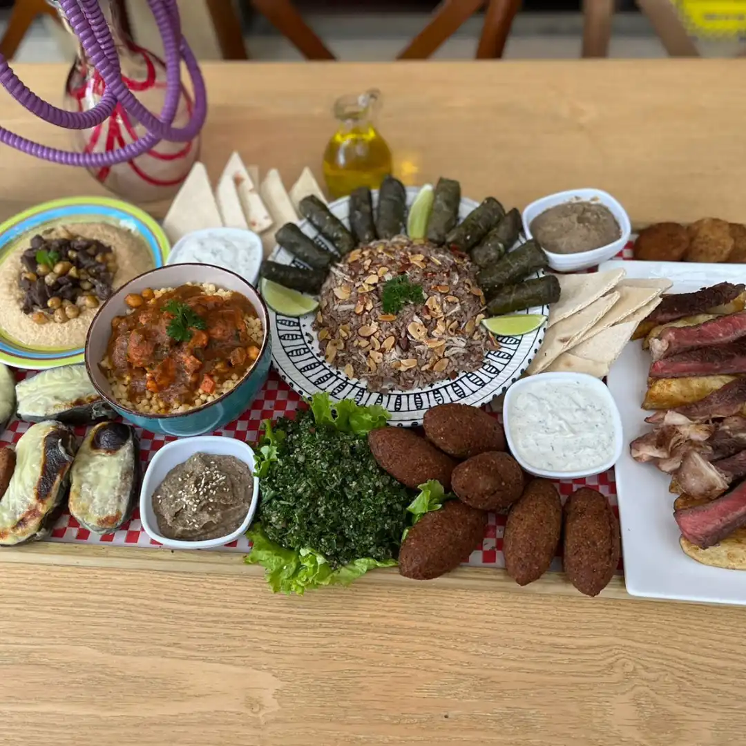 Fusión de sabores árabes representados con: Arroz de lentejas, falafel, babaganoush, tahine, hojas de parra, repollos rellenos tabule y pan árabe de la casa.