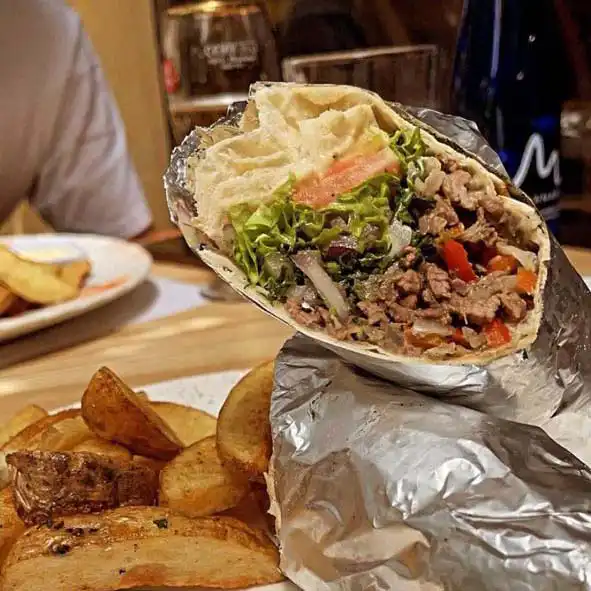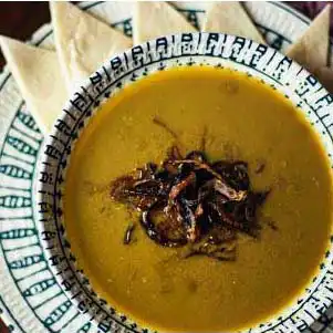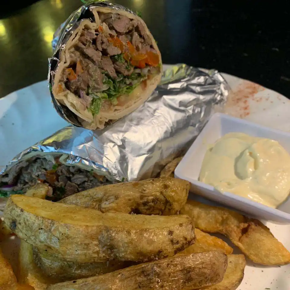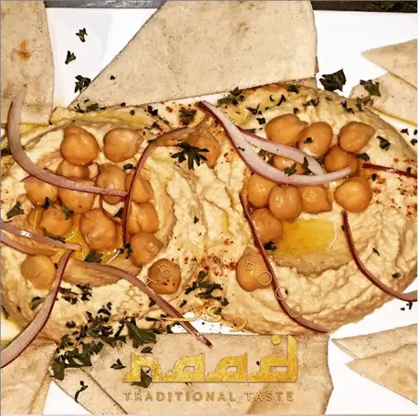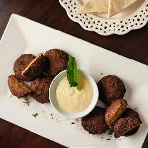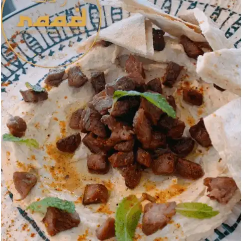 Crema de garbanzo, trocitos de carne de cordero preparado en base de Ajonjolí, aceite de oliva, ajo, sal y limón. Acompañado con pan árabe de la casa.