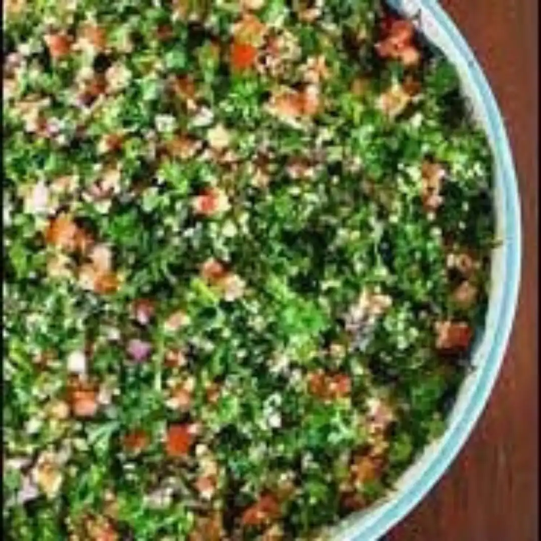 Ensalada árabe con base de tomate, perejil, trigo bulgur y mix de especias aromatizadas con aceite de oliva y limón. Acompañado con pan árabe de la casa