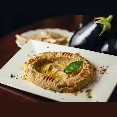 Crema de berenjena, preparado en una base de ajonjolí, aceite de oliva, ajo, sal y limón. Acompañado con pan árabe de la casa.