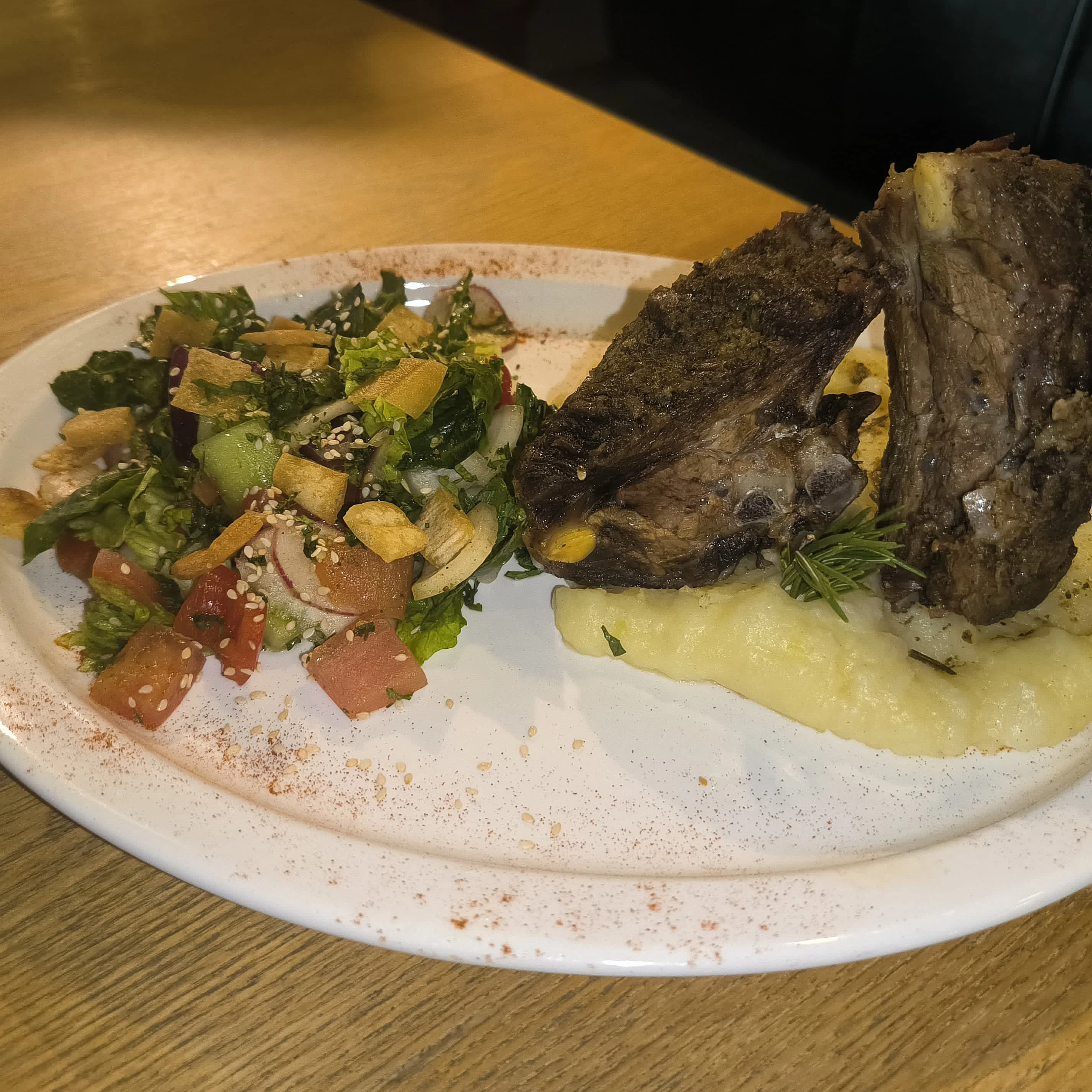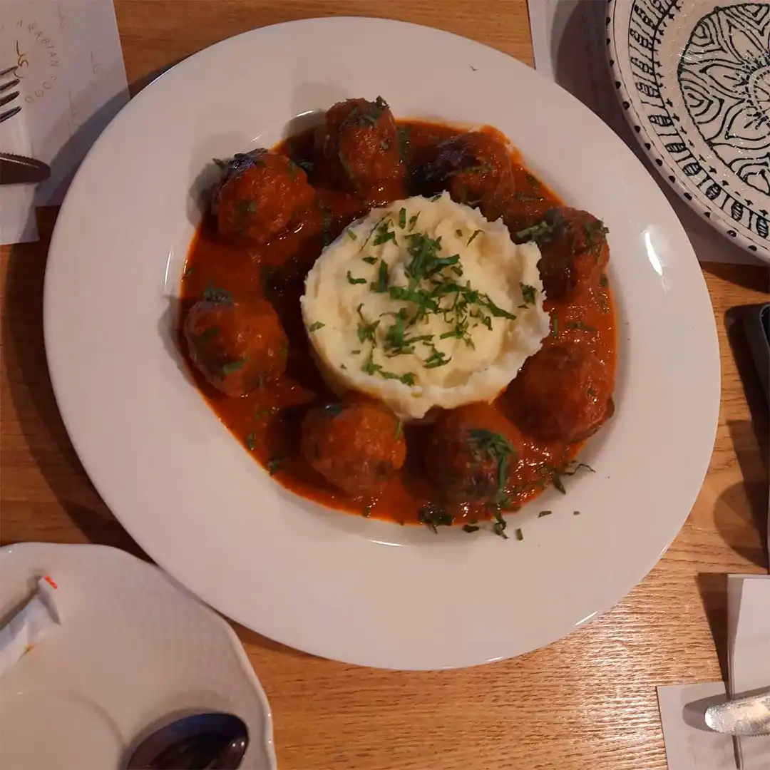 Albóndigas de cordero sazonadas con una mezcla de especias del mundo árabe, acompañadas de puré y ensalada fattoush.